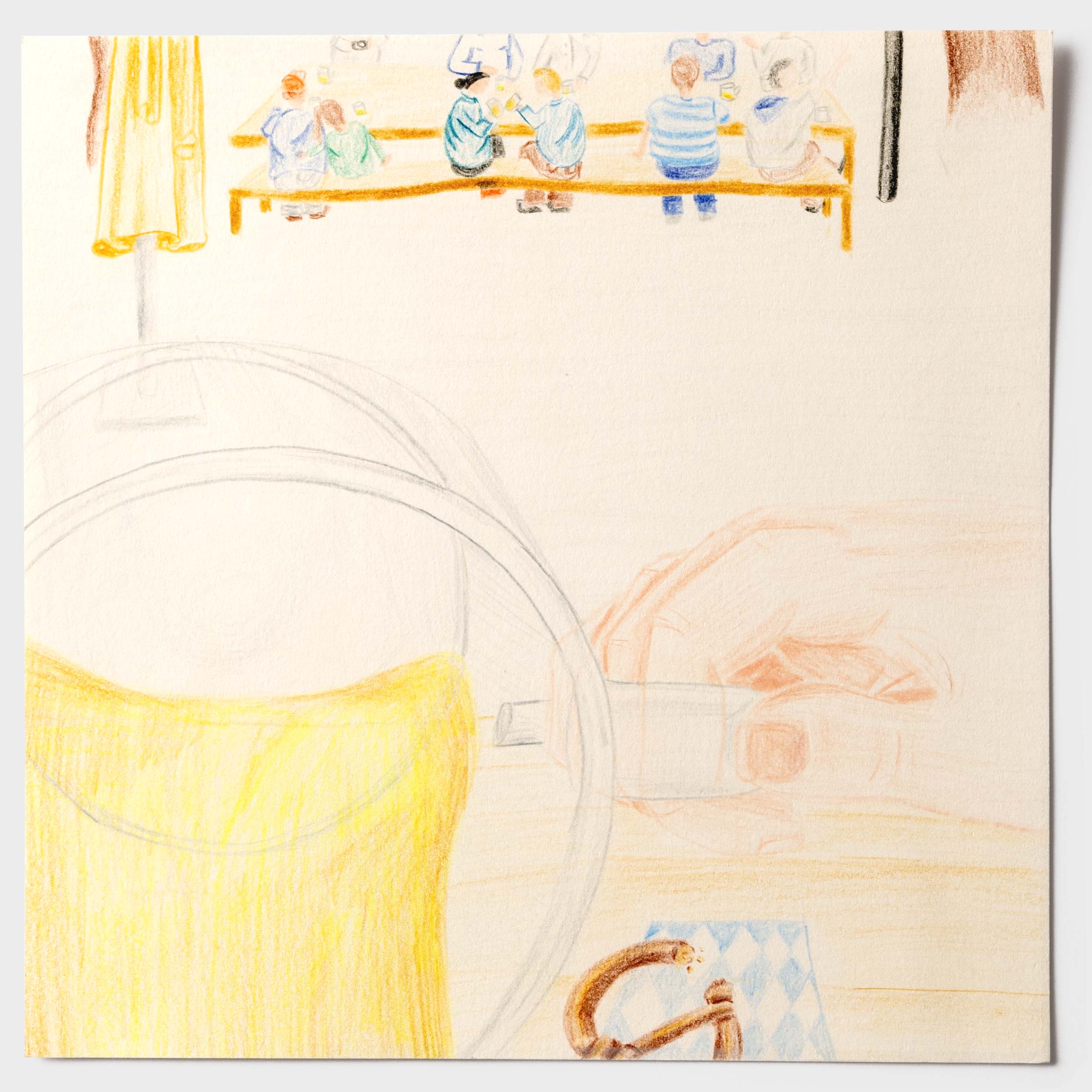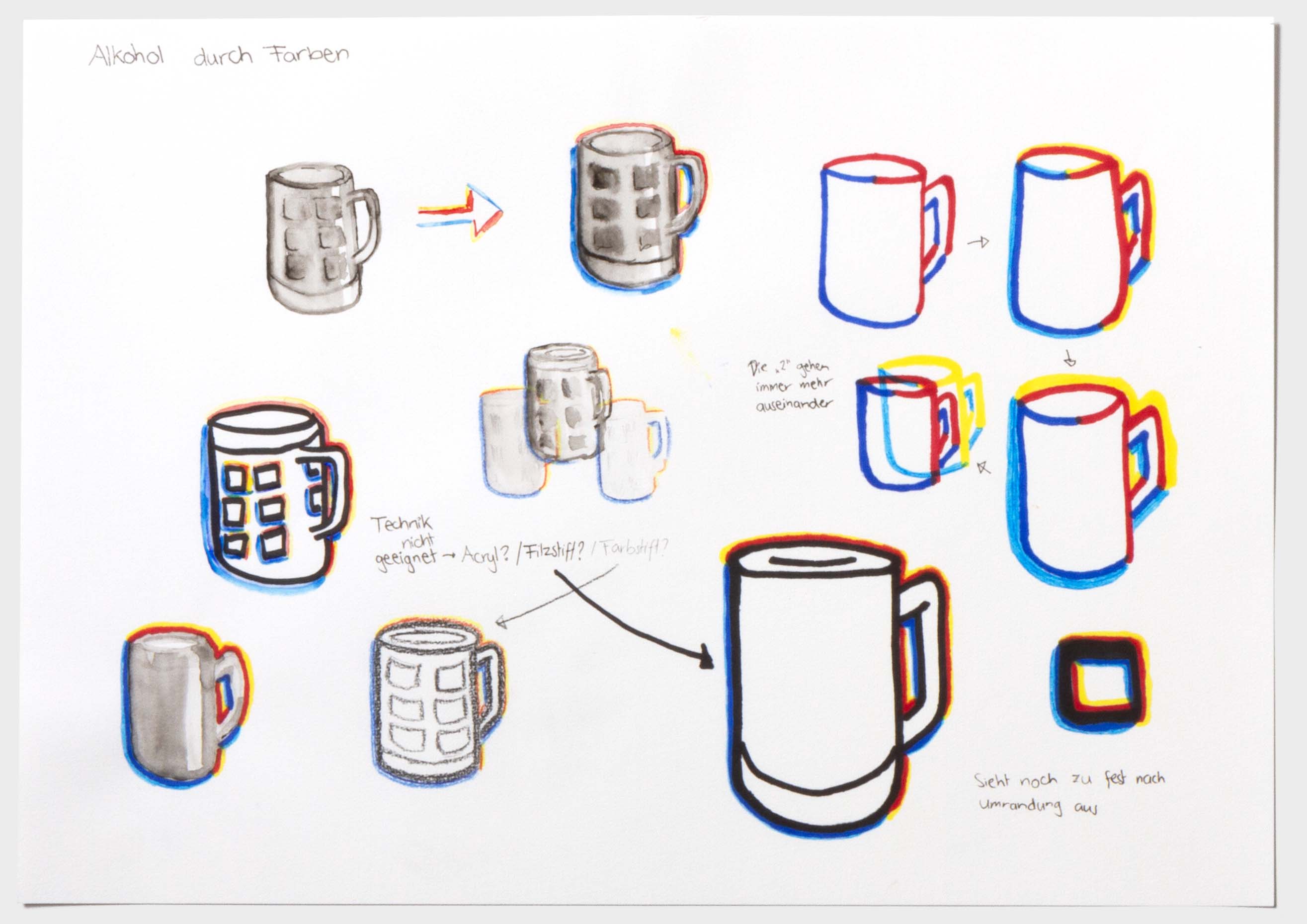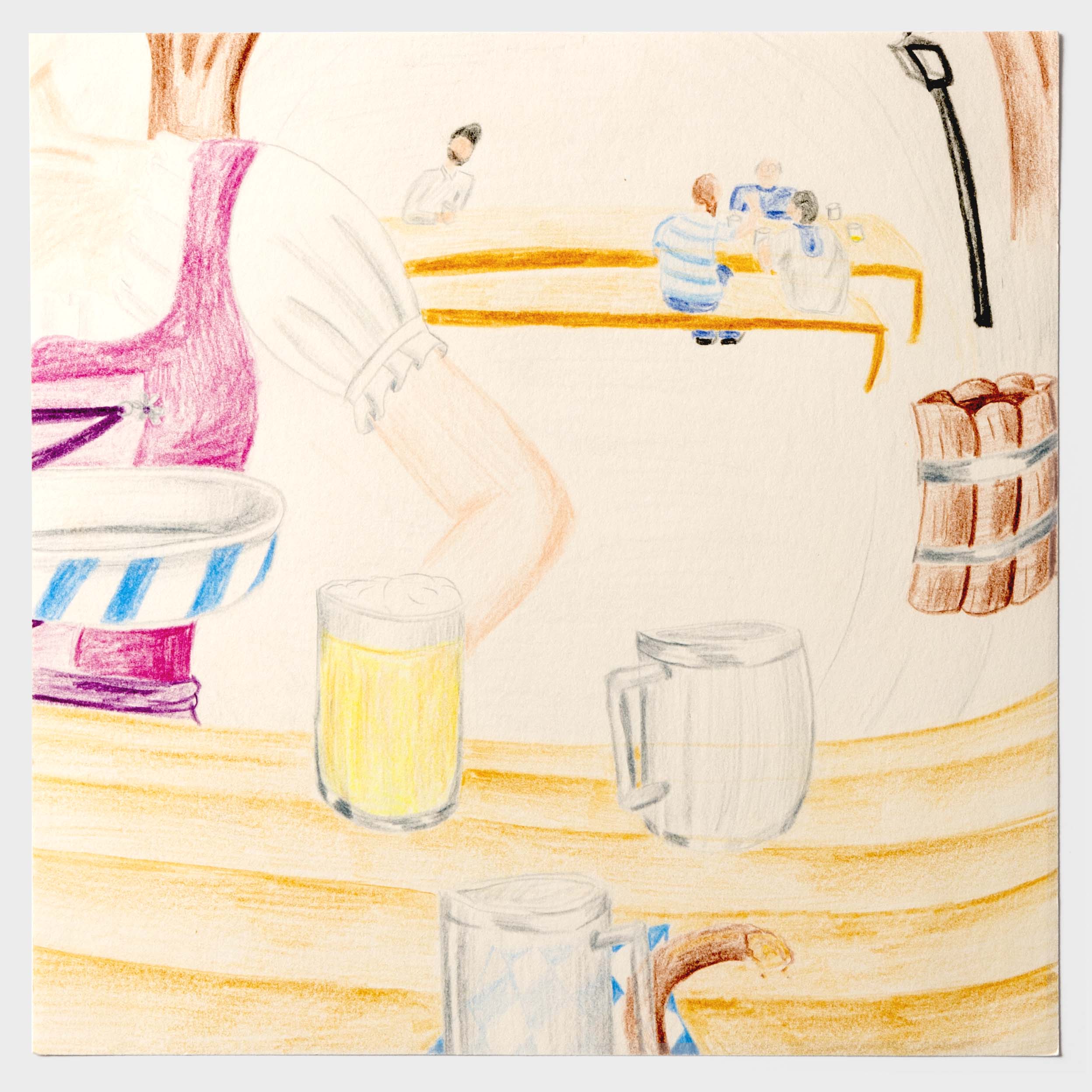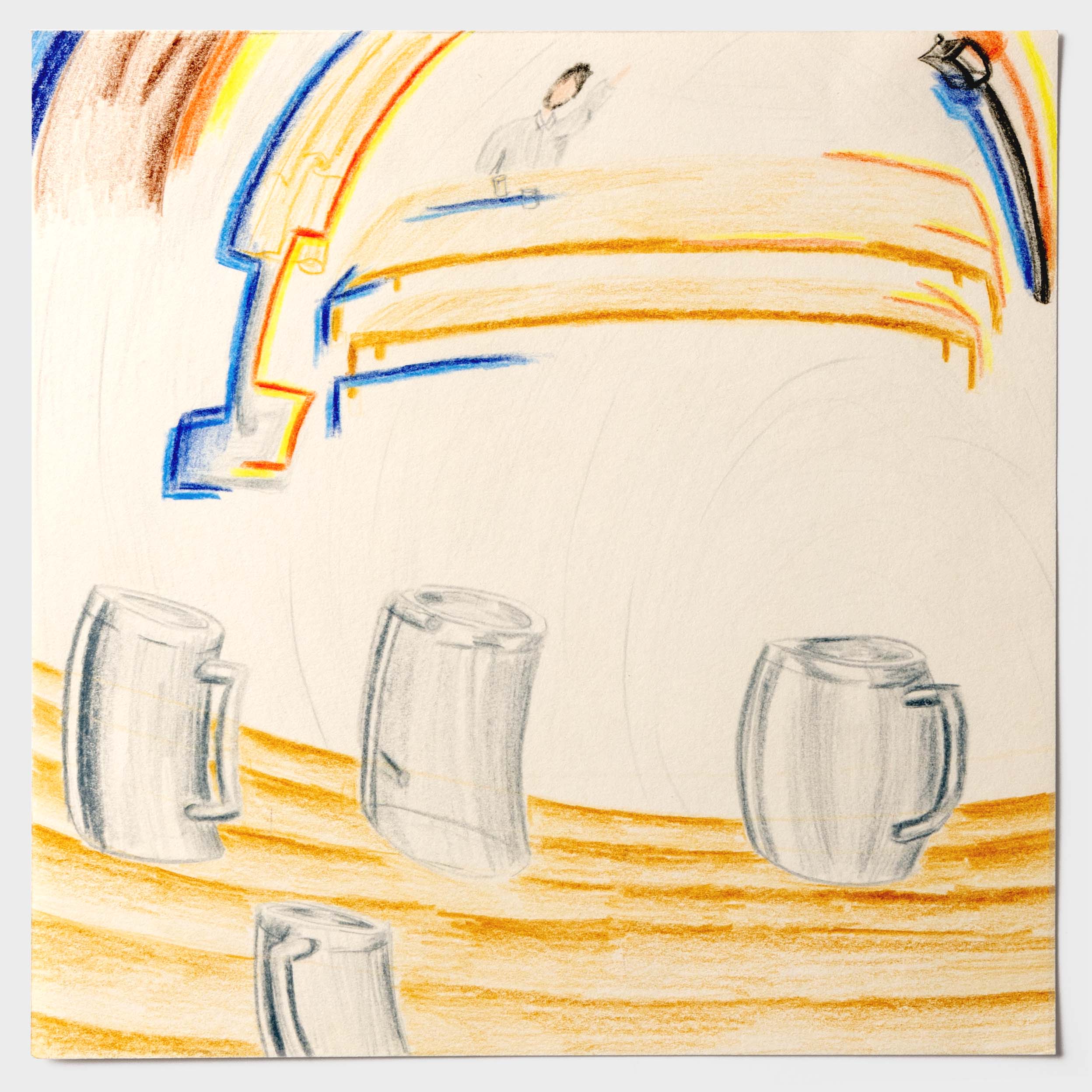 Wie ein Betrunkener sehen. Der ein oder andere hat bestimmt schon einmal nach einem Humpen Bier zu viel, nicht mehr ganz klar gesehen. Doch wie kann man diese Sicht eigentlich auf Papier bringen? Nach einem langen Prozess jene Frage zu verfolgen, ist diese Bilderreihe entstanden. Die Bildreihe steigert sich bis ins Abstrakte. Ich habe die wilde betrunken Art in meinem Zeichnungsstil aufgenommen und ebenso wild darauf losgemalt. Diese Wucht verleiht der Bildreihe eine schwungvolle Dynamik. Des Weiteren war es eine gute Erfahrung, die Hemmungen von «Fehler» beim Zeichnen abzulegen.