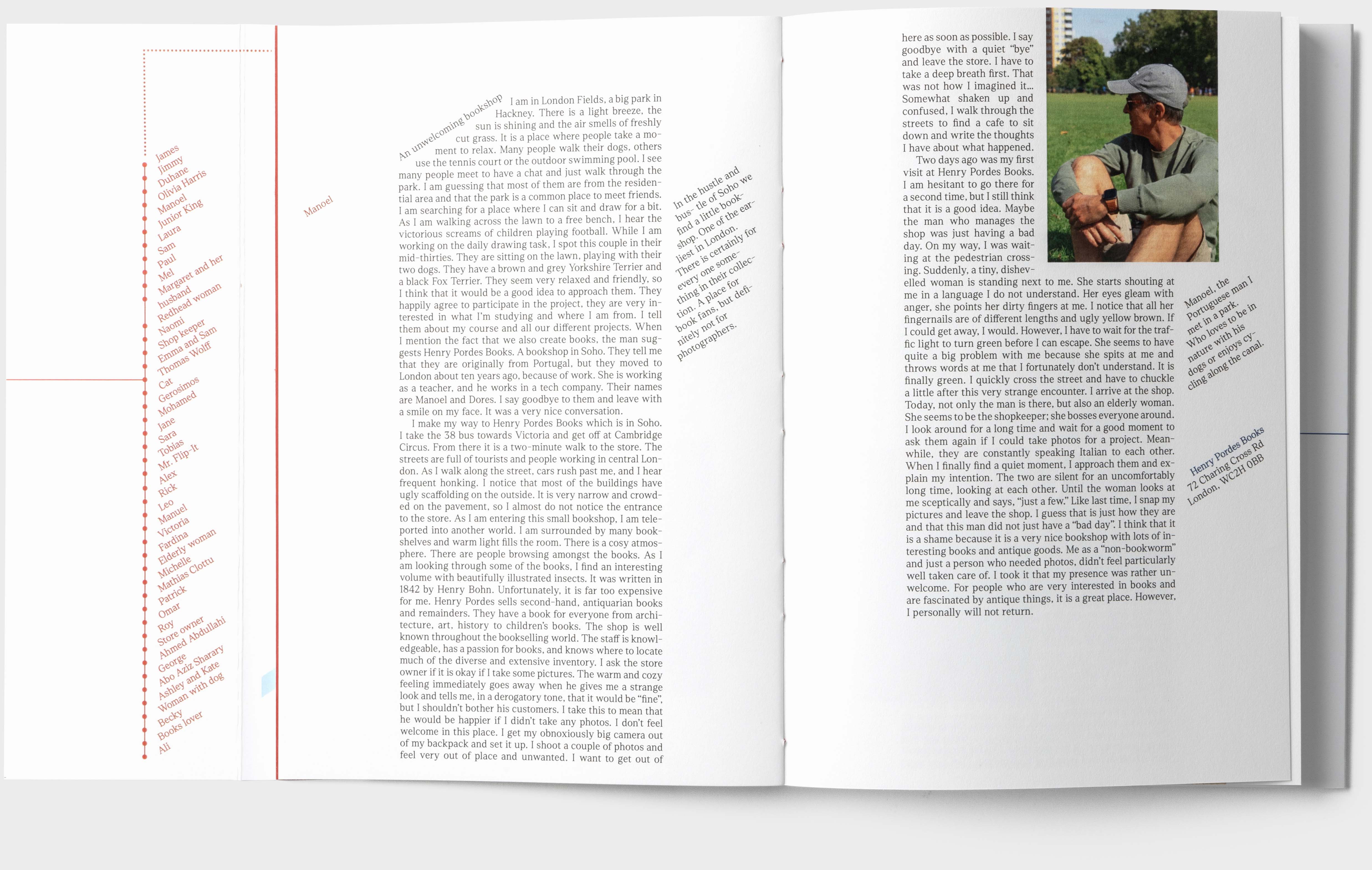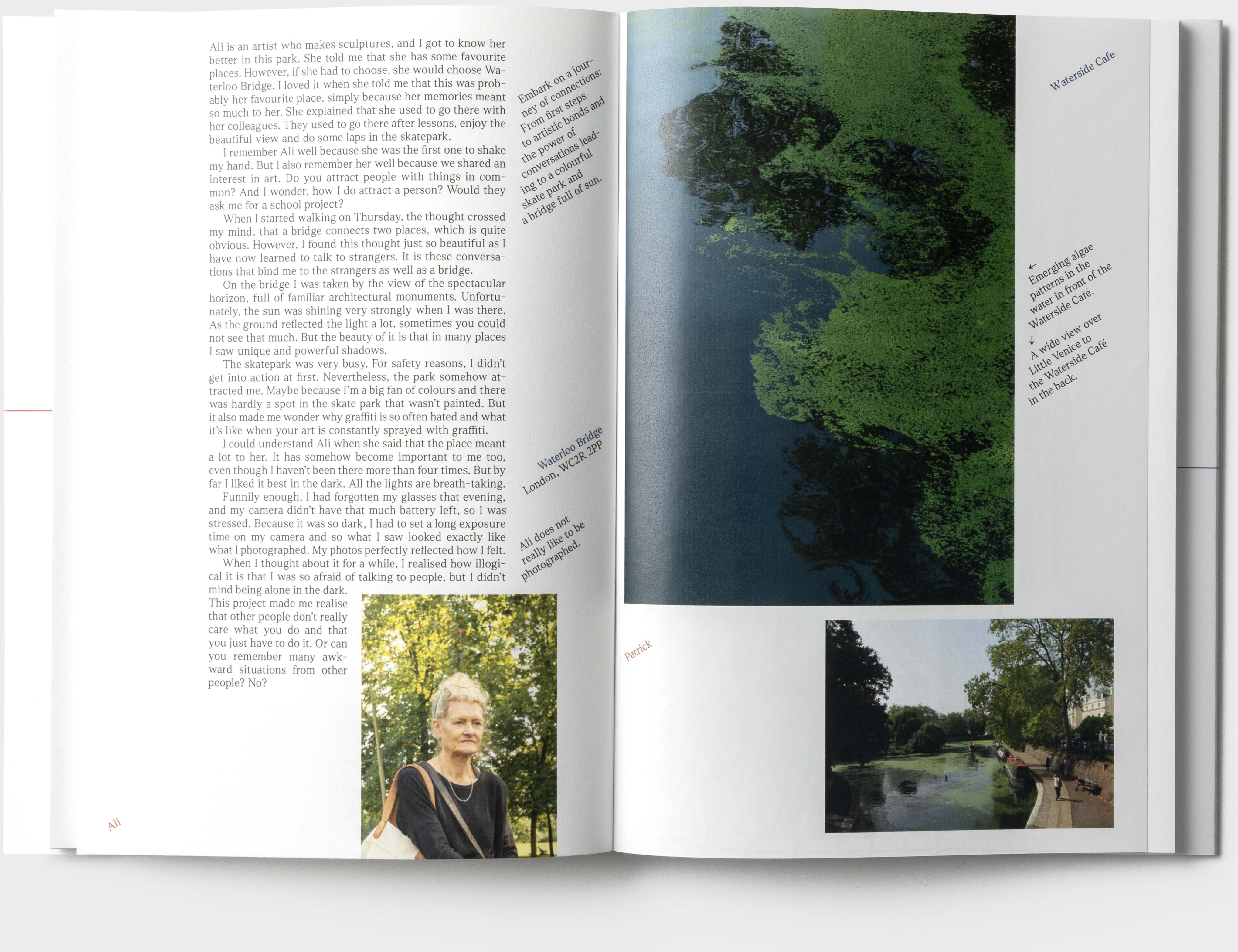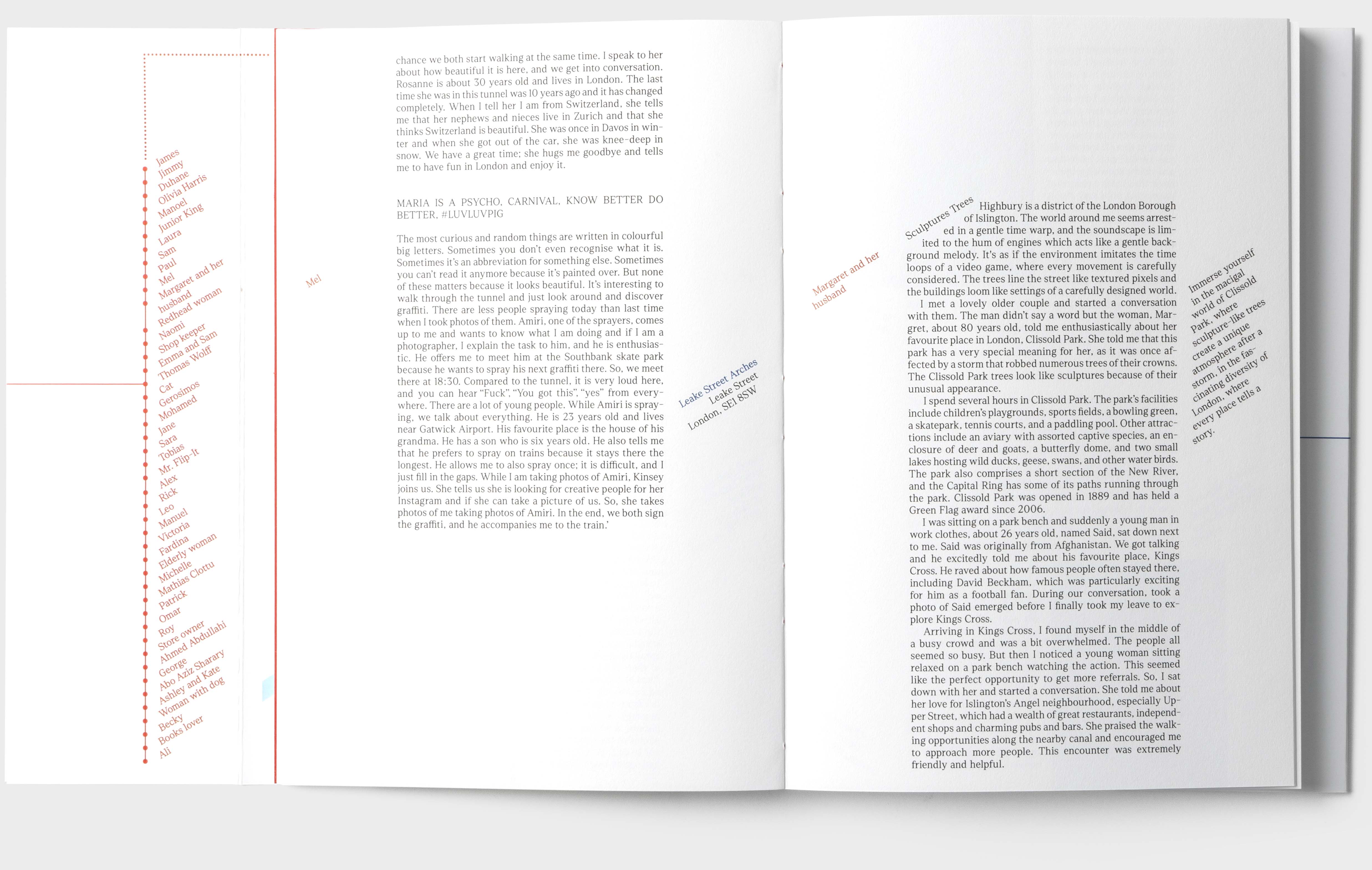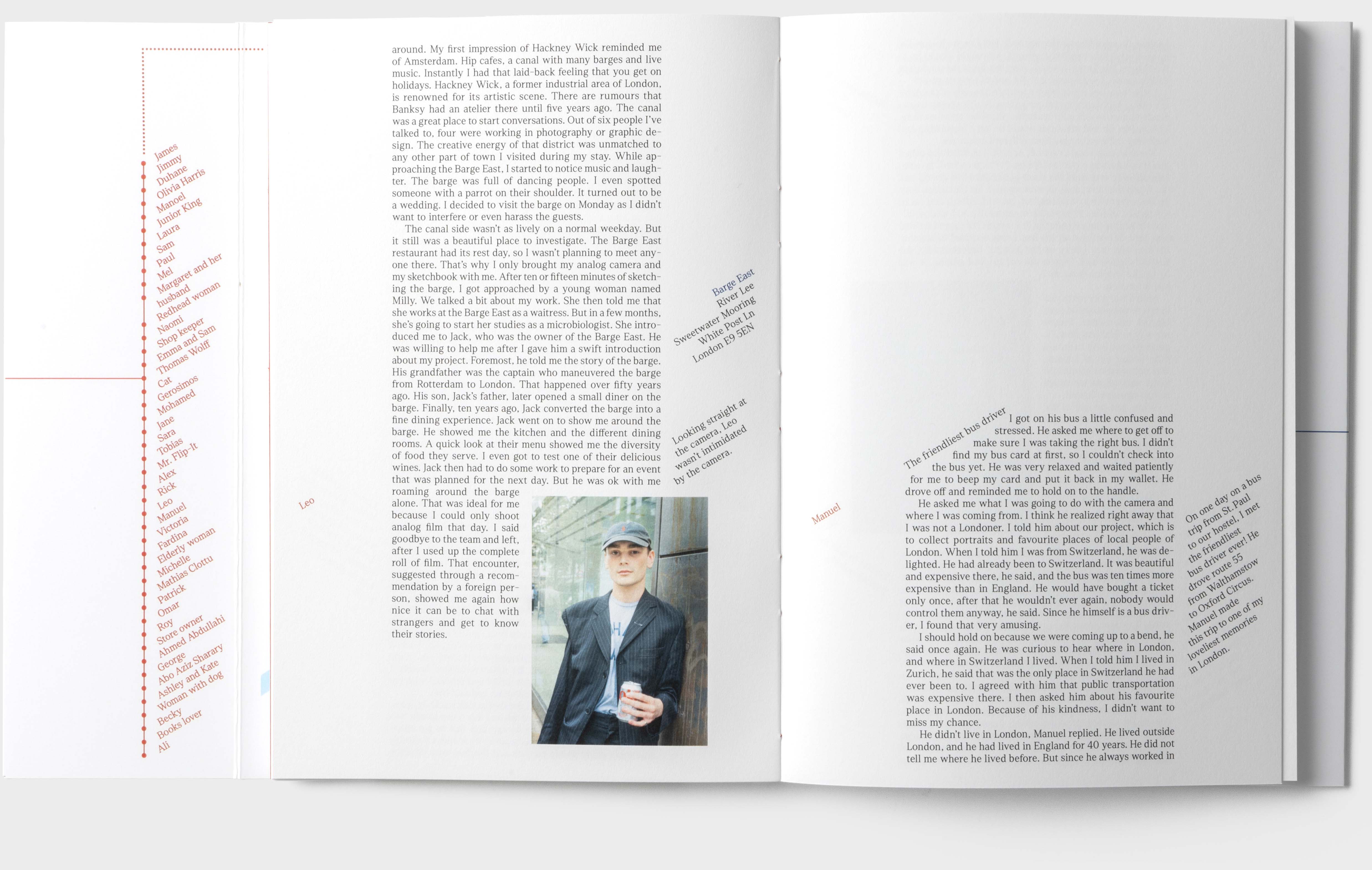 Guided by the people of London. Nowadays it is possible to travel and have minimal contact with the local population. But during a 10-day stay in London, my fellow students and I were guided by the people of London. We asked people about their favourite places and then tried to find and portray them without the help of digital tools. I collated these places in my book and used the underground as a form of navigation. You can follow the blue line to discover the places or hop on the red line to get to know the people. In this way, the reader is able to experience London as closely as possible.