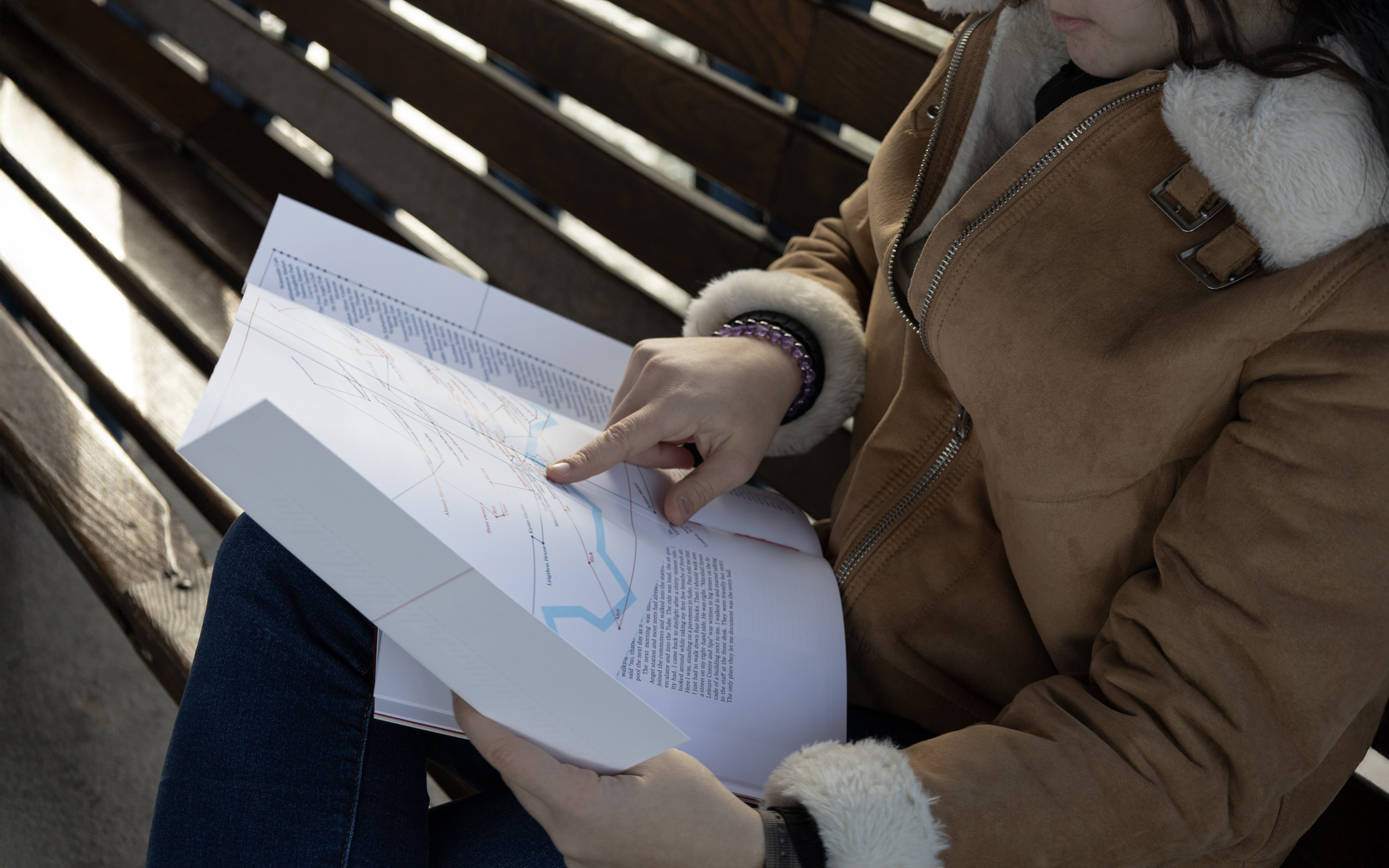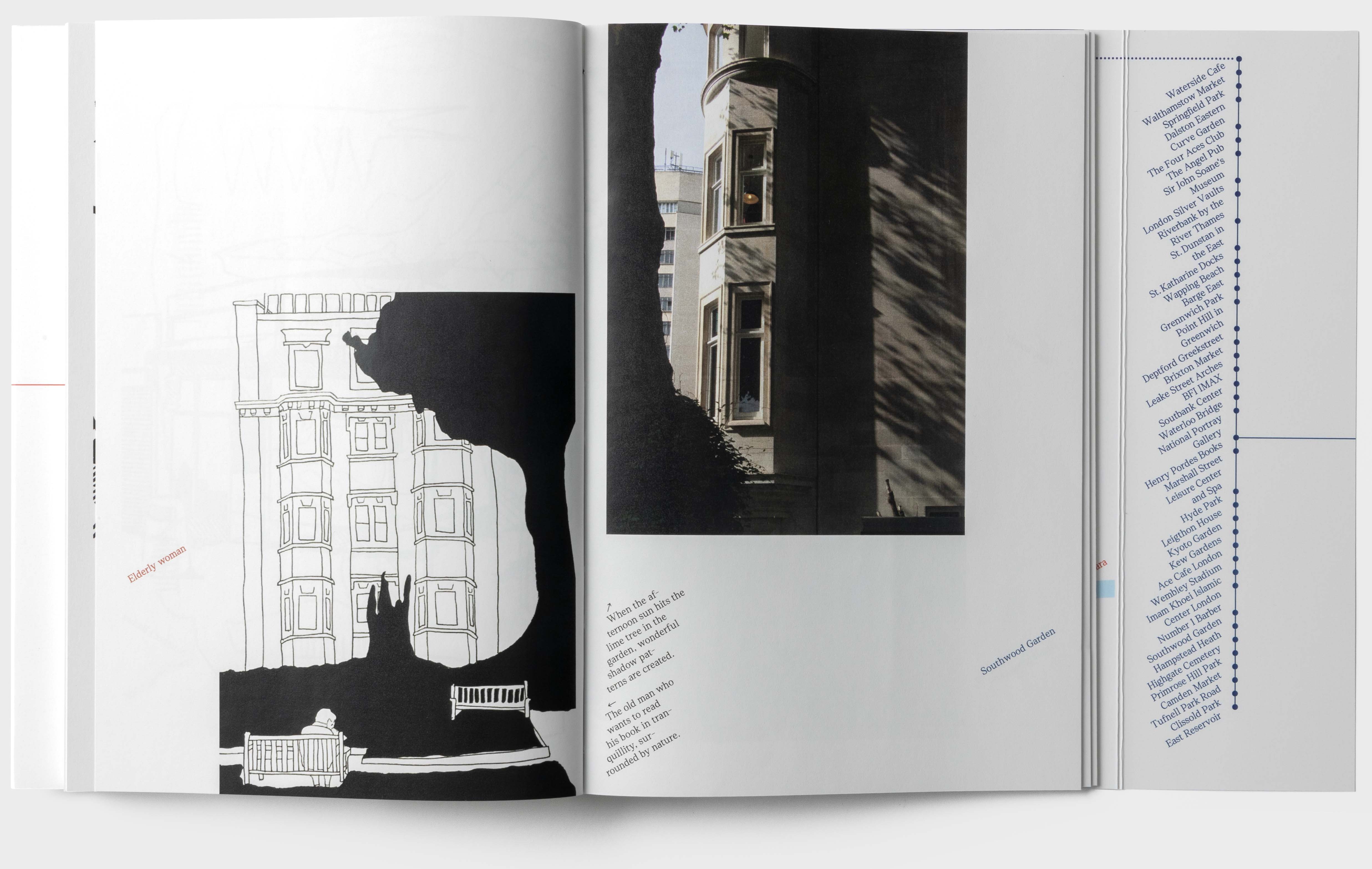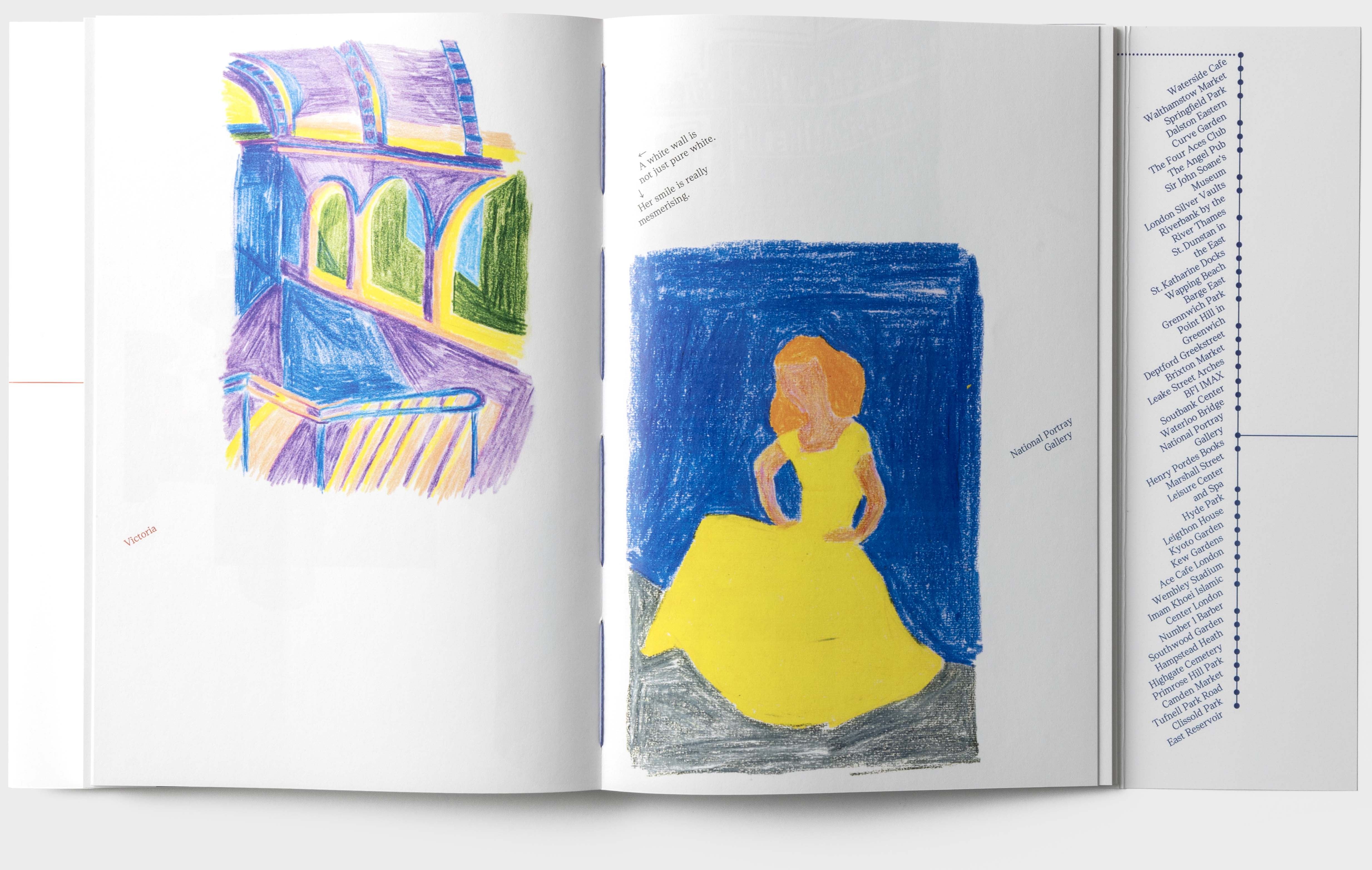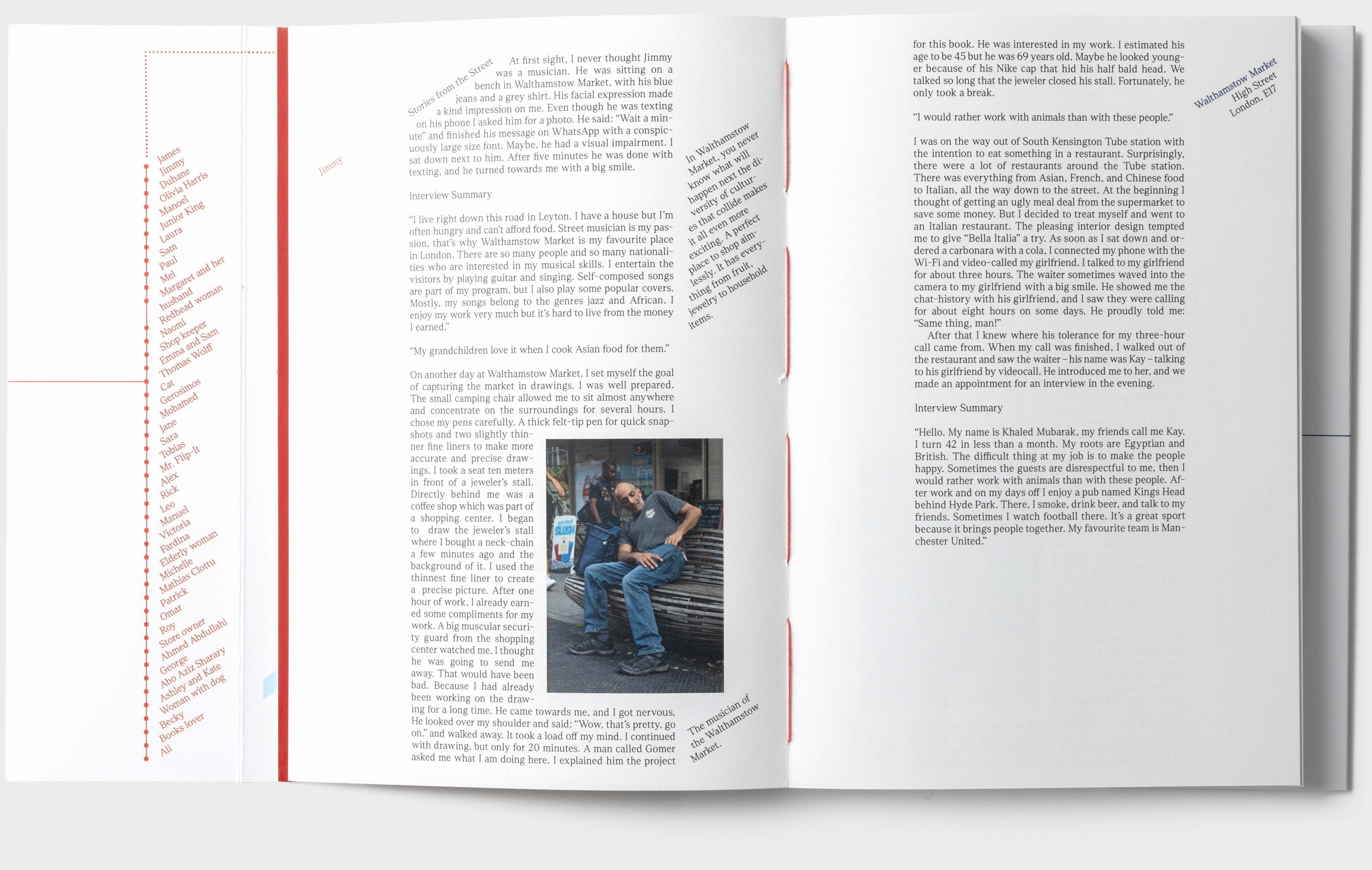 Guided by the people of London. Nowadays it is possible to travel and have minimal contact with the local population. But during a 10-day stay in London, my fellow students and I were guided by the people of London. We asked people about their favourite places and then tried to find and portray them without the help of digital tools. I collated these places in my book and used the underground as a form of navigation. You can follow the blue line to discover the places or hop on the red line to get to know the people. In this way, the reader is able to experience London as closely as possible.